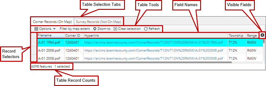 Clicking on the Survey Records (Not On Map) Tab activates the attribute table for the survey records.